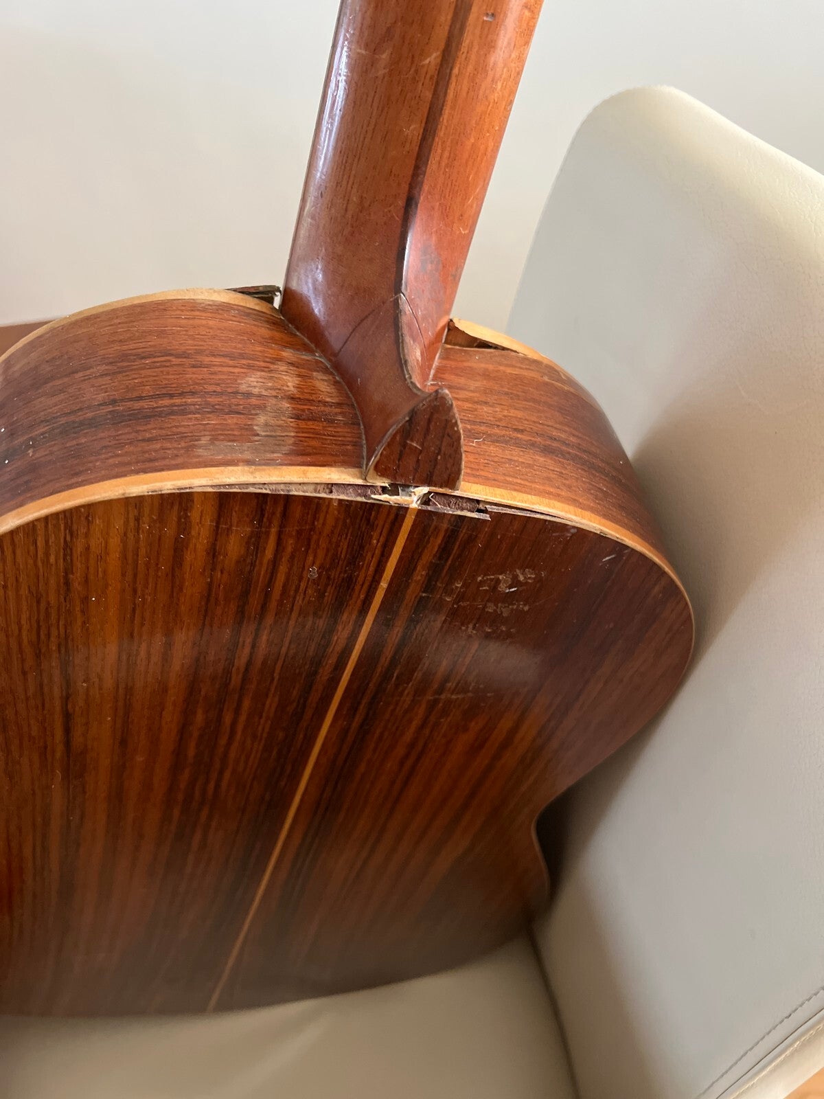 Dit mooie, degelijk gebouwd instrument van massief Indisch palissander en een mooie kwaliteit massief spruce bovenblad met een prachtige fijne nerf was gebroken. De gitaar had zichtbare vochtsporen en had waarschijnlijk langdurig in een erg vochtige ruimte gestaan of gelegen.