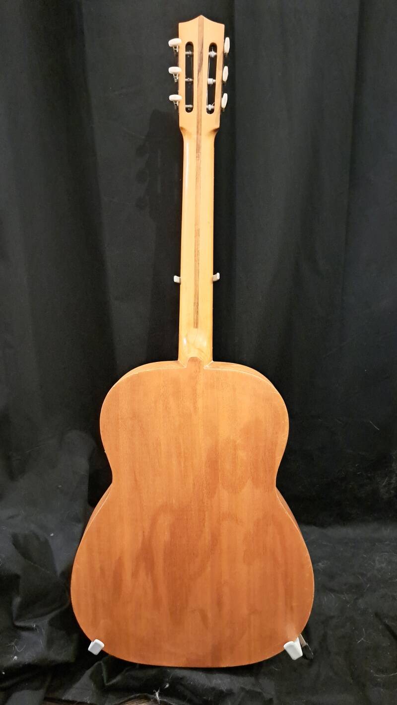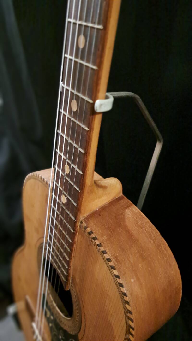 Deze gitaar heeft ook een beetje geschiedenis gemaakt in de Nederlandse popmuziek van de jaren '60 en '70. Ik heb haar gekocht van Rinus Brekelmans, drummer van een van de wat betere (Utrechtse) bandjes uit die tijd, de Faction Four. Het is goed mogelijk dat met deze gitaar in het verleden liedjes zijn geschreven die we nog in oude hitlijsten kunnen terugluisteren. Ik heb de gitaar in een goede staat gekocht en eigenlijk alleen de frets bijgewerkt en de versiering onder het klankgat vastgezet. Verder heb ik de gitaar afgesteld en voorzien van een setje nieuwe nylon snaren.